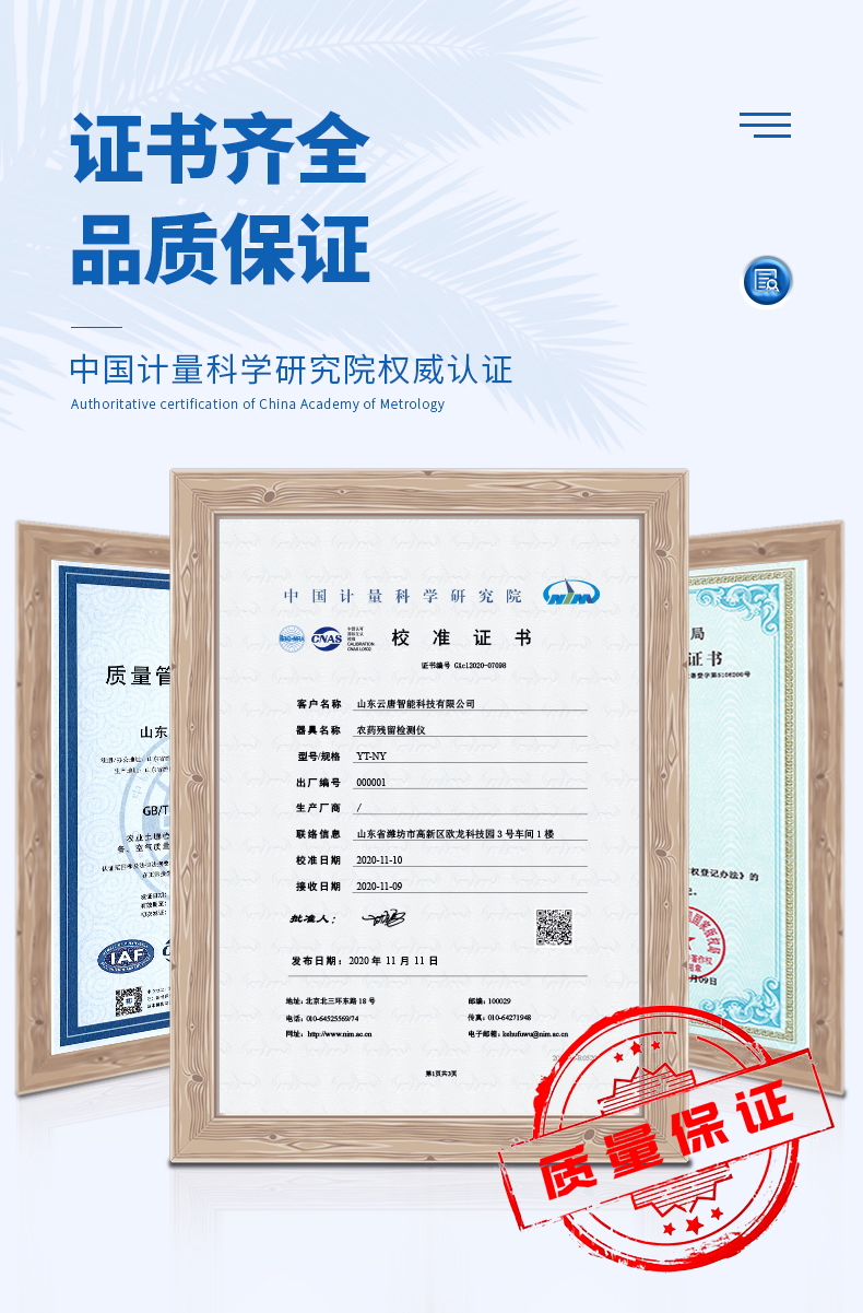 11、安全證書,放心保障:儀器具有中國計(jì)量科學(xué)研究院校準(zhǔn)證書,權(quán)威認(rèn)證,使用放心。