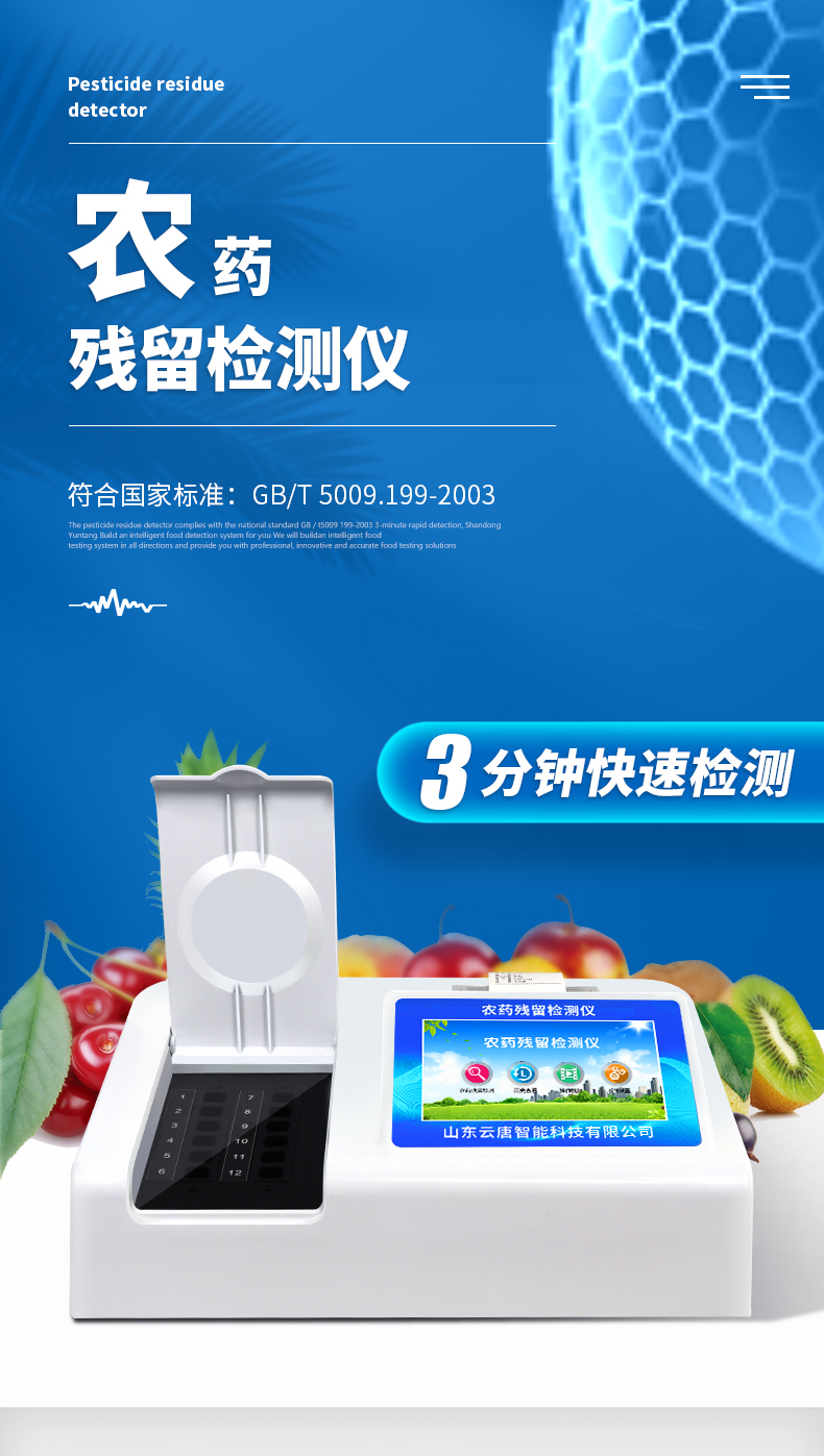 山東云唐智能科技有限公司生產(chǎn)的農(nóng)藥殘留檢測儀廣泛應(yīng)用于主要用于蔬菜、水果、茶葉、糧食、農(nóng)副產(chǎn)品等食品中農(nóng)藥殘留的快速檢測,依據(jù)國標(biāo)GB/T5009.199-2003進(jìn)行檢測,適用于果蔬茶生產(chǎn)基地以及農(nóng)貿(mào)批發(fā)銷售市場現(xiàn)場檢測,餐館、學(xué)校、食堂、家庭果蔬加工前的安全速測等。