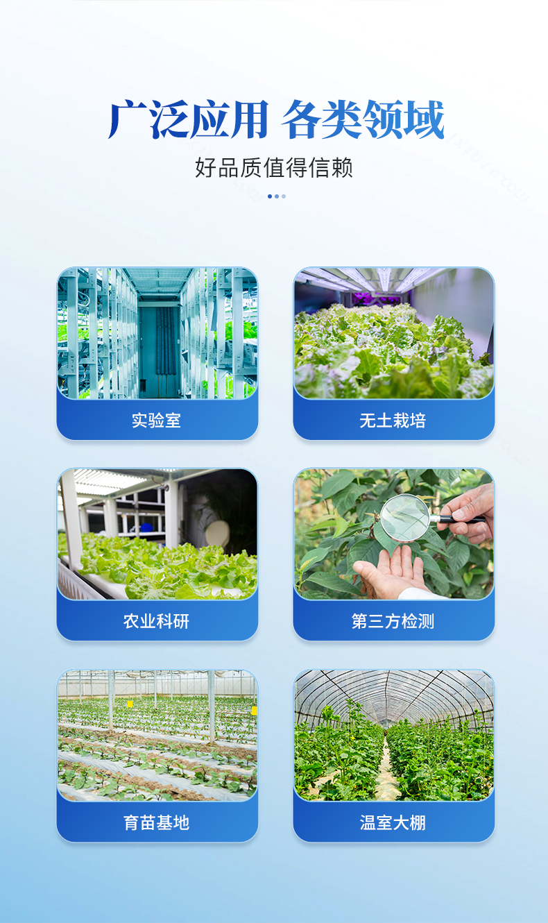 .適用于節(jié)水農(nóng)業(yè)灌溉、溫室大棚、花卉蔬菜、作物栽培、農(nóng)業(yè)實驗室、草地牧場、植物培養(yǎng)、科學試驗等領(lǐng)域。
