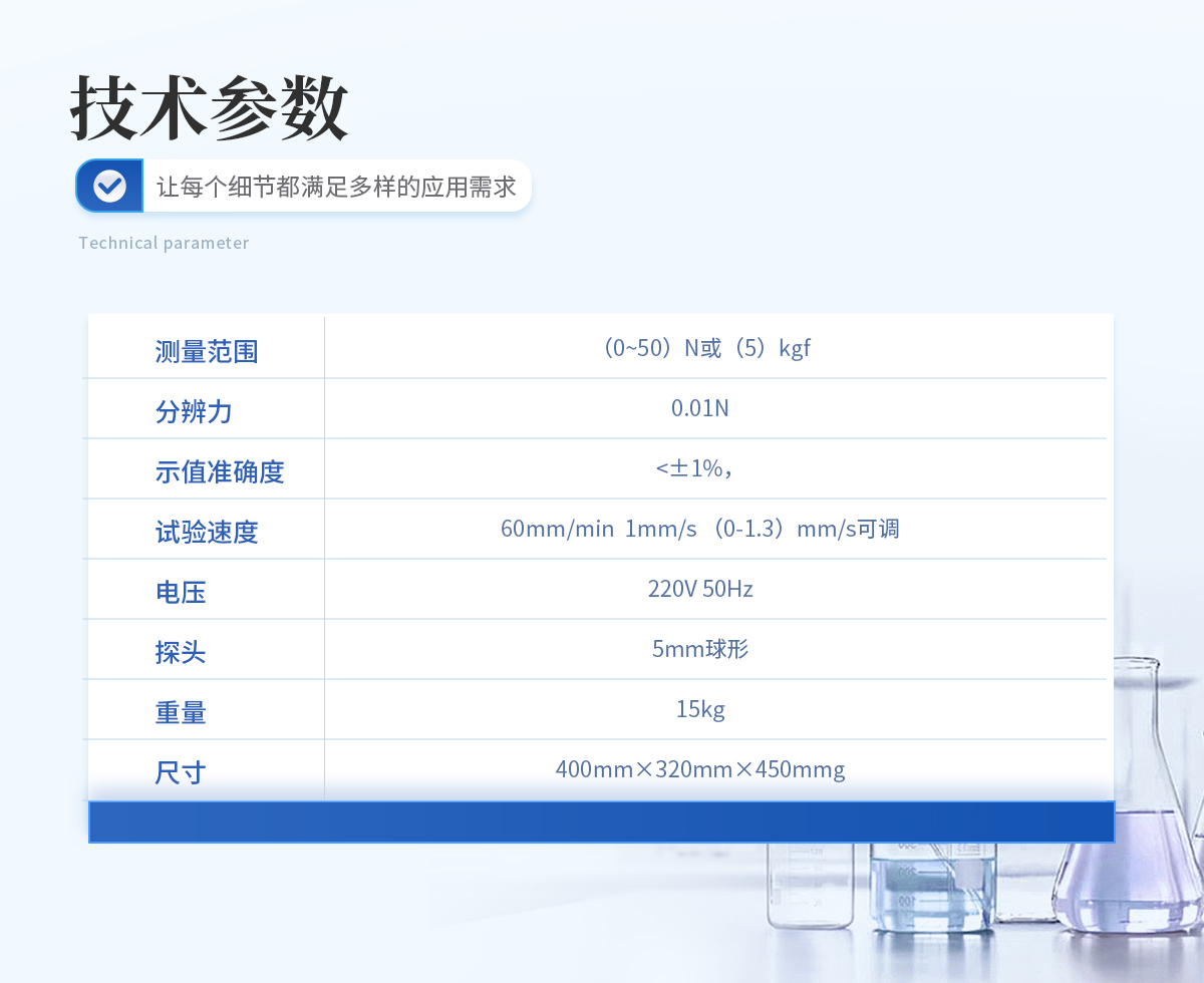 測量范圍:(0~50)N或(5)kgf 分辨力:0.01N 示值準確度:<±1% 試驗速度:60mm/min 1mm/s (0-1.3)mm/s可調(diào) 電壓:220V 50Hz 探頭:5mm球形 單位:g.cm 重量:15kg 尺寸:400mm×320mm×450mm