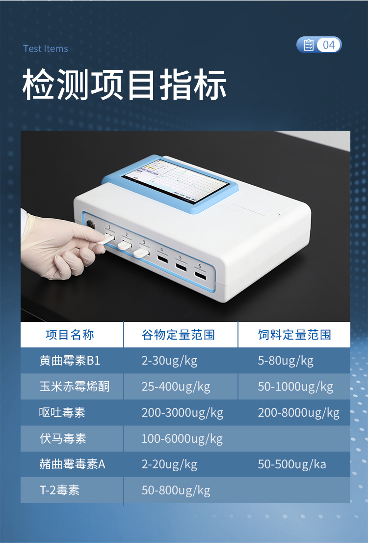YT-L03型真菌毒素快速檢測儀采用熒光定量快速檢測原理,主要檢測糧油谷物飼料中真菌毒素含量,包括黃曲霉毒素、玉米赤霉烯酮、嘔吐毒素、伏馬毒素、赭曲霉毒素、T-2毒素等等,檢測樣品涵蓋糧食谷物(大米、玉米、小麥、大麥、高粱等)及其制品、飼料及其原料、食用油脂、牛奶及其制品等;樣品前處理簡單,整個檢測過程檢測12min,產(chǎn)品適用于地方糧庫、谷物生產(chǎn)企業(yè)、飼料廠、各類畜牧養(yǎng)殖企業(yè)、面粉廠、食品加工廠、第三方檢測機構(gòu)及各級政府監(jiān)管部門。