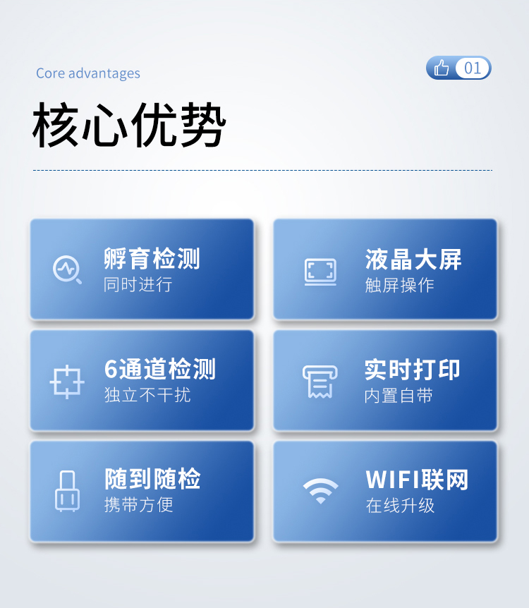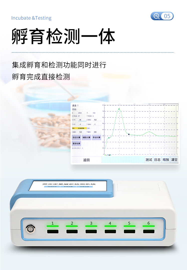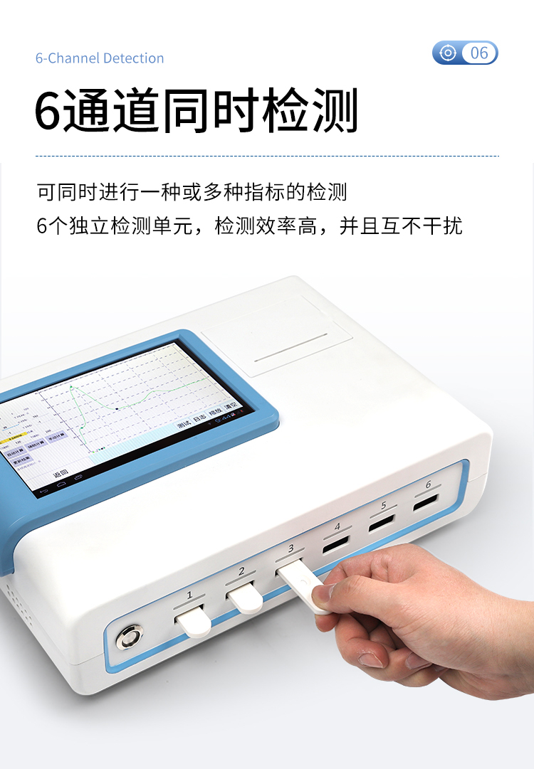 5、6通道設(shè)計,可同時進行一種或多種指標的檢測,6個獨立檢測單元,檢測效率高,并且互不干擾;