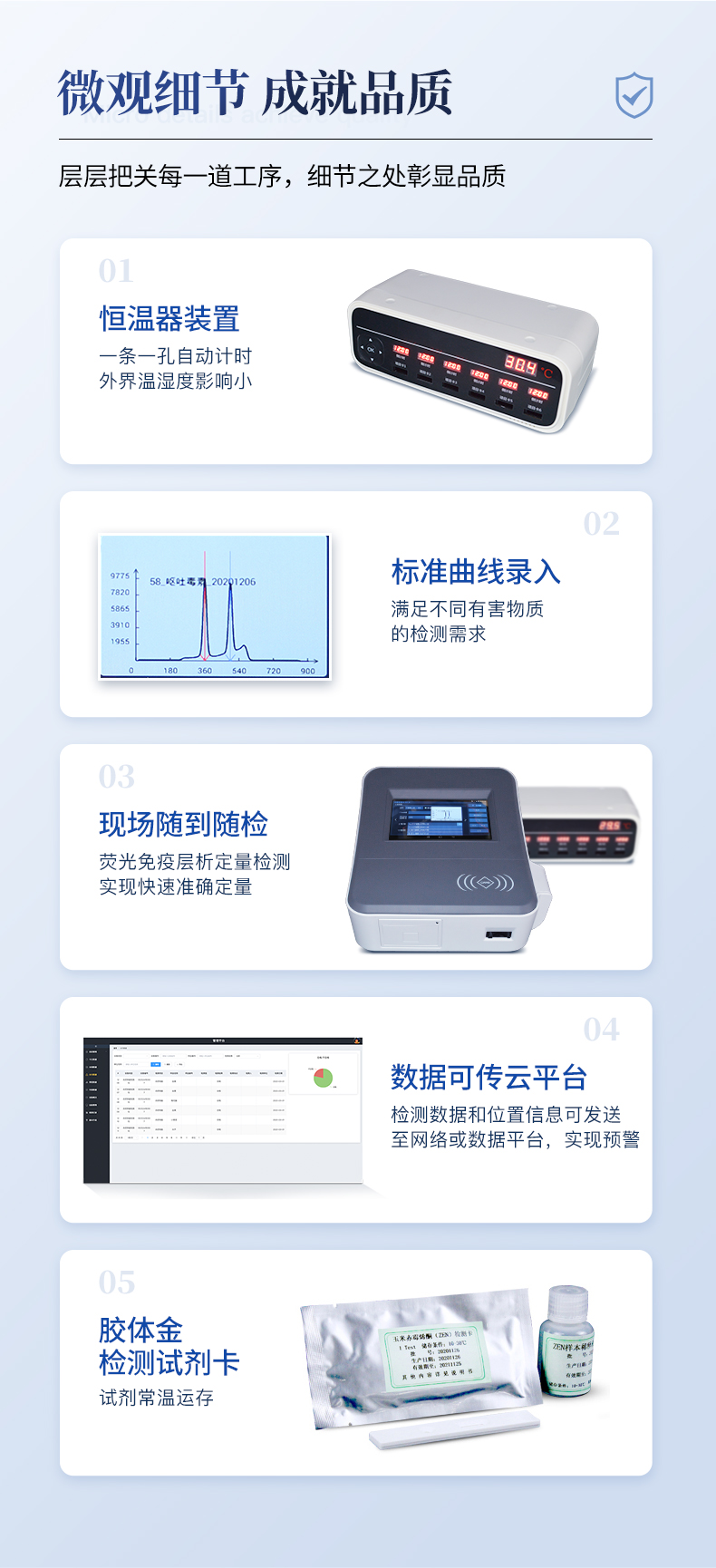 1、儀器自動識別檢測卡條形碼上的檢測項目、樣本類型、檢測限、標(biāo)準(zhǔn)曲線,形成完整的檢測數(shù)據(jù)信息鏈。一卡一控,插卡后儀器自動讀取檢測卡顯示的C、T線的熒光信號,依據(jù)檢測卡內(nèi)置的標(biāo)準(zhǔn)曲線,自動計算結(jié)果;用戶可根據(jù)自身需求,選擇設(shè)定檢測限/定量限(內(nèi)控或國家標(biāo)準(zhǔn)限量)。