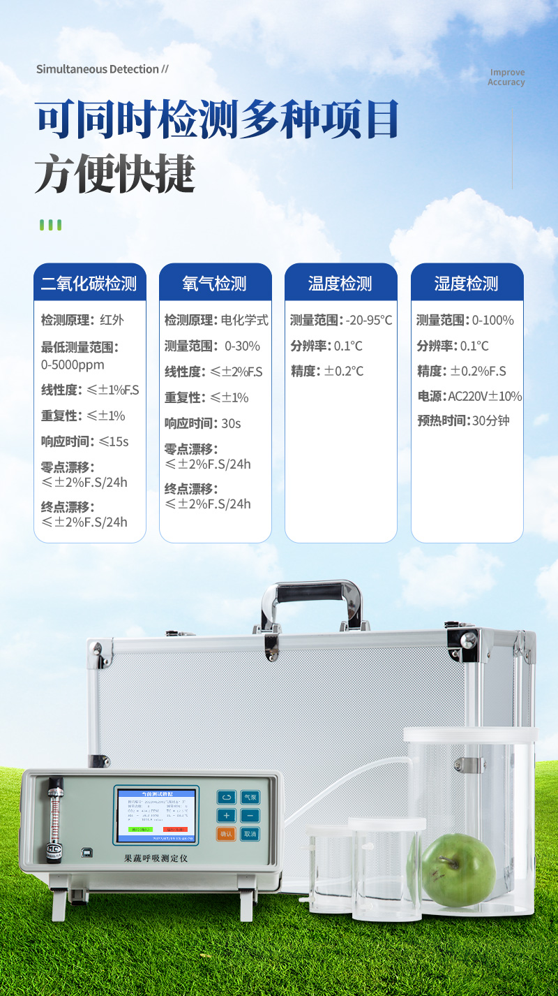 果蔬呼吸測(cè)定儀專門(mén)用于常溫、冷藏庫(kù)、氣調(diào)庫(kù)、超市冷柜等儲(chǔ)藏條件下的果品和蔬菜呼吸強(qiáng)度的測(cè)定和分析研究。該儀器的特點(diǎn)是可以根據(jù)果蔬的 大小來(lái)選擇不同體積的呼吸室,加快了平衡和測(cè)定時(shí)間;可以同時(shí)顯示呼吸室的CO2濃度、O2濃度、溫度和濕度。該儀器具有多功能、高精度、快速、**、方 便等特點(diǎn),非常適合于食品,園藝、果品、蔬菜、外貿(mào)等各類(lèi)學(xué)校、科研院所用于各類(lèi)果品和蔬菜的呼吸測(cè)定。