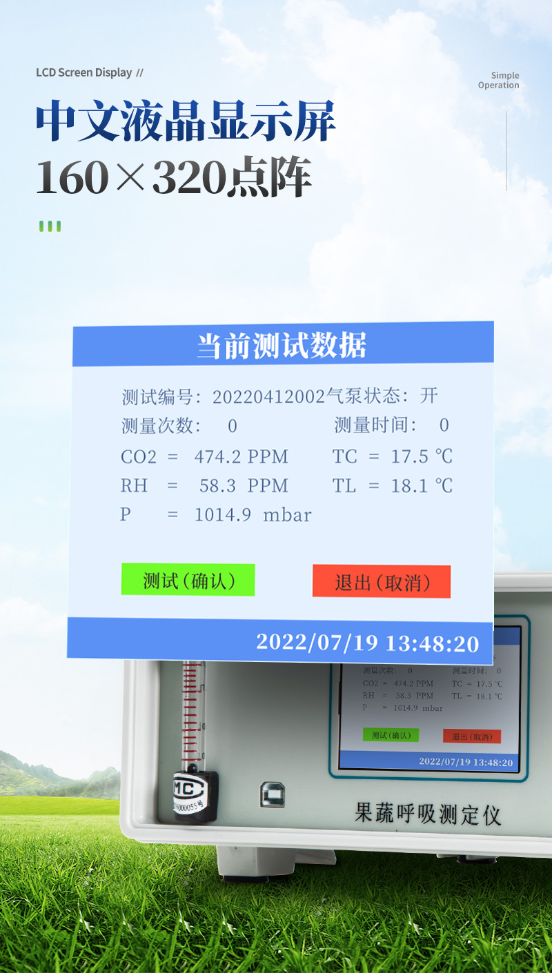 | 將待測(cè)果品或者蔬菜放入響應(yīng)的呼吸室,并將呼吸室的蓋子擰緊 | 用氣管將主機(jī)與呼吸室連接起來(lái),連接好主機(jī)電源,給主機(jī)上電 | 設(shè)定采集時(shí)間間隔并輸入用戶名,進(jìn)入數(shù)據(jù)測(cè)量,打開(kāi)氣泵預(yù)熱 | 預(yù)熱30分鐘左右后,按“確認(rèn)”鍵開(kāi)始自動(dòng)記錄數(shù)據(jù)變化 | 測(cè)試結(jié)束后,斷開(kāi)主機(jī)電源,取出SD卡,將數(shù)據(jù)導(dǎo)入電腦 | 將記錄的數(shù)據(jù)輸入到呼吸強(qiáng)度計(jì)算軟件內(nèi),計(jì)算并保存結(jié)果 |