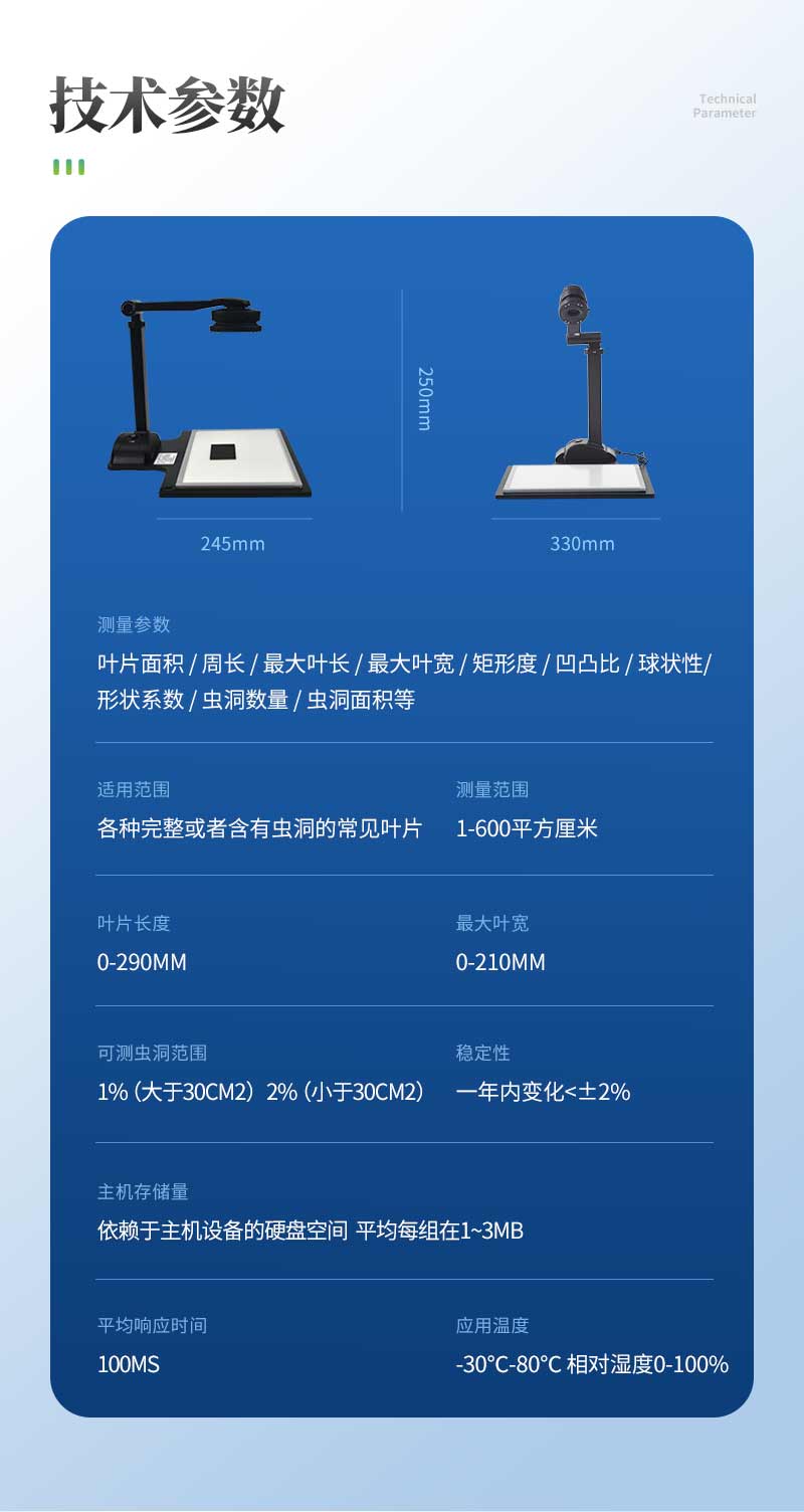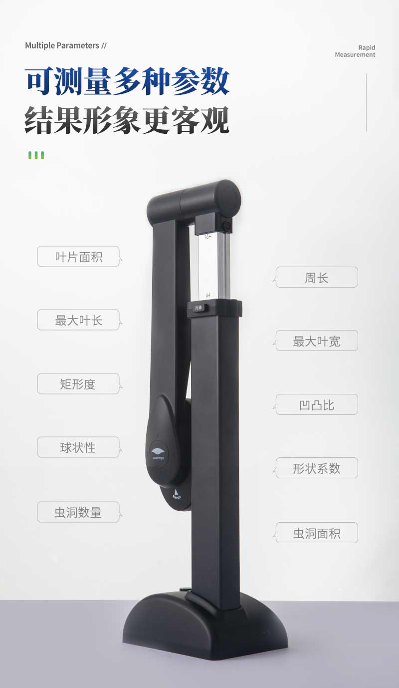 智能拍照式葉面積測量系統(tǒng)由圖像采集儀和裝入自主開發(fā)軟件的平板組成,采用本公司多年積累的面積測量算法,根據(jù)葉片輪廓特征提取、圖形實物轉(zhuǎn)換、邊緣檢測等技術(shù),能夠形象并快速得到所測葉片面積、周長、蟲洞數(shù)量等參數(shù)。相比傳統(tǒng)的葉面積,具有測量更快速簡便、結(jié)果更形象客觀、數(shù)據(jù)多樣并大大減少了人為操作帶來的誤差。