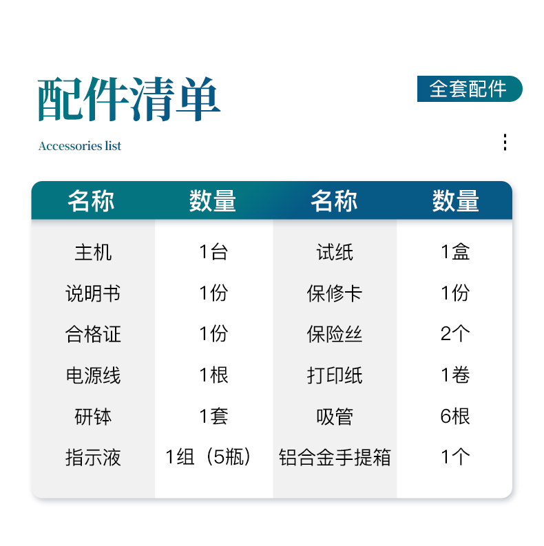 1、主機(jī)一臺 2、試紙一盒 3、保險絲2個 4、電源線一根 5、打印紙一卷 6、指示液五種