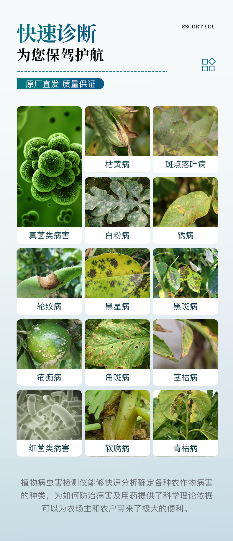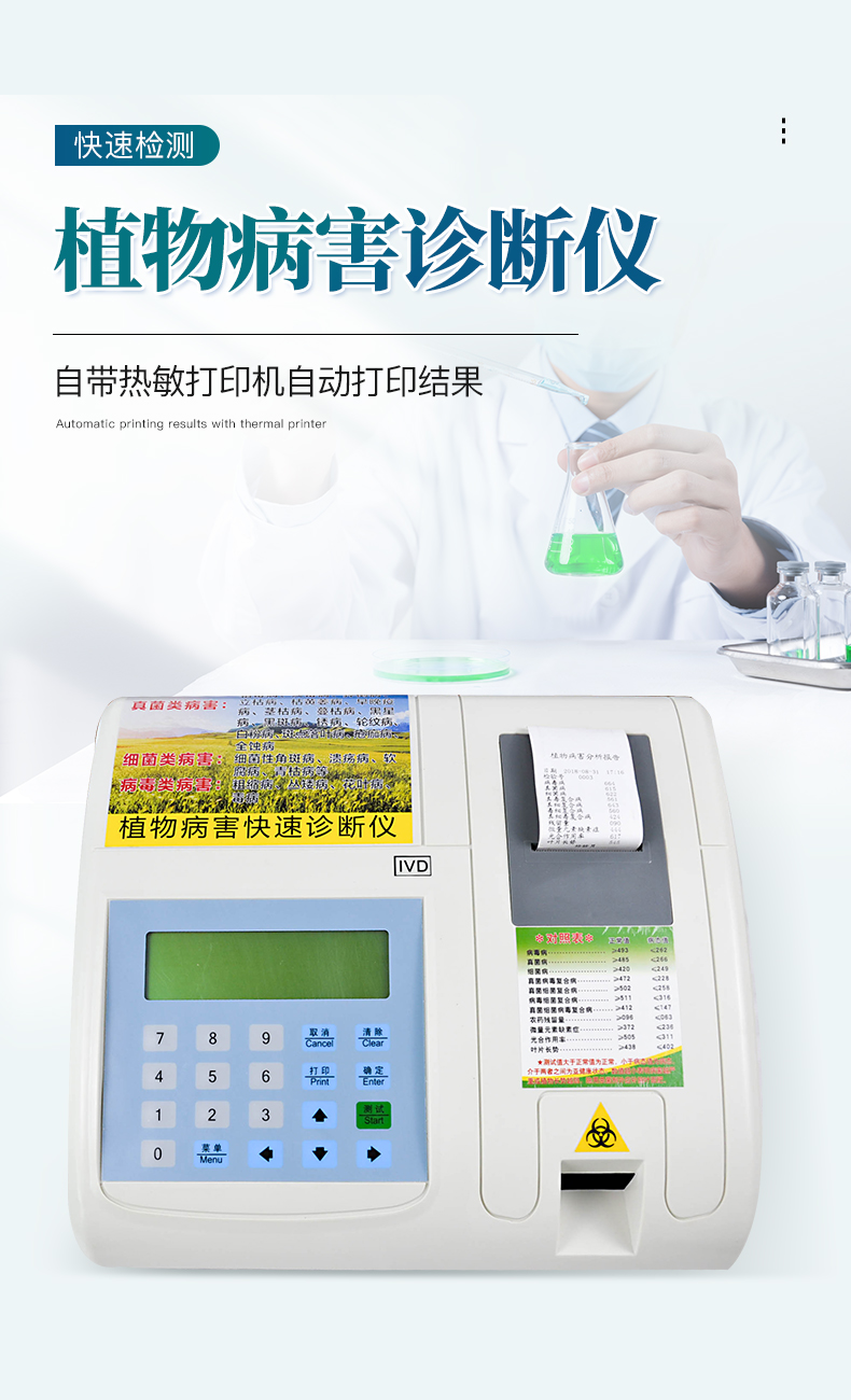 植物病害的檢測是一種復(fù)雜的化學(xué)和物理過程,從實(shí)驗(yàn)室走入實(shí)際應(yīng)用一直是人們追求的目標(biāo),該儀器能夠快速分析確定各種農(nóng)作物病害的種類。為如何防治病害及用藥提供了科學(xué)理論依據(jù),為農(nóng)場主和農(nóng)戶帶來了極大的便利。
