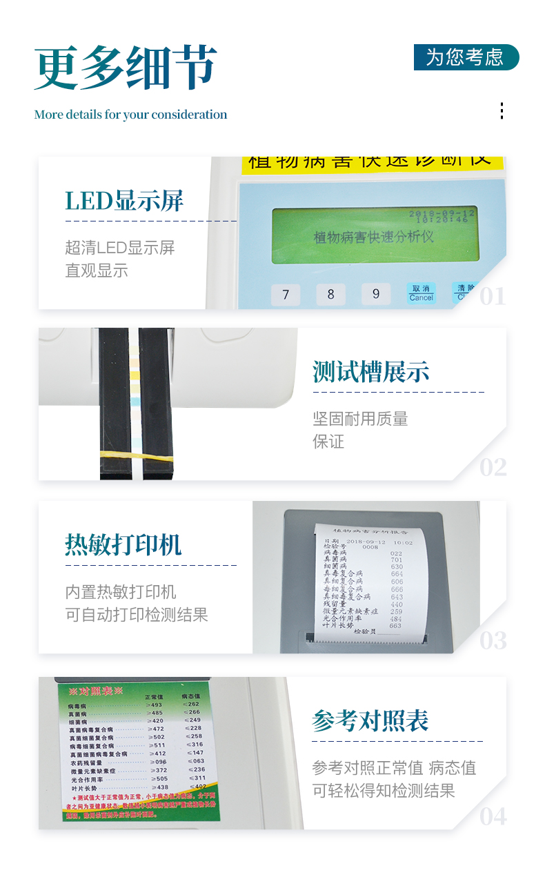 測試值為指導(dǎo)用藥參考值,測試數(shù)值越少表明作物病害越嚴(yán)重或植物長勢越弱,除用殺菌劑外應(yīng)補(bǔ)施葉面肥,用量不能越過某種藥品的限量值,否則產(chǎn)生藥害。
