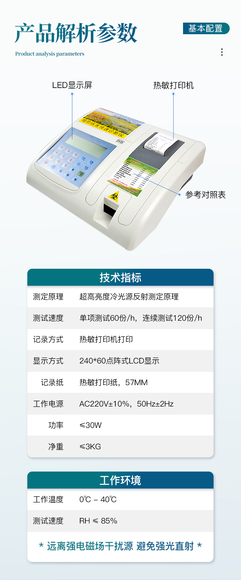 | 測定原理:超高亮度冷光源反射測定原理。 | 測試速度:單項(xiàng)測試60份/小時,連續(xù)測試120份/小時。 | 記錄方式:熱敏打印機(jī)打印。 | 顯示方式:240*60點(diǎn)陣式LCD顯示。 | 記錄紙:熱敏打印紙,57mm。 | 工作環(huán)境: