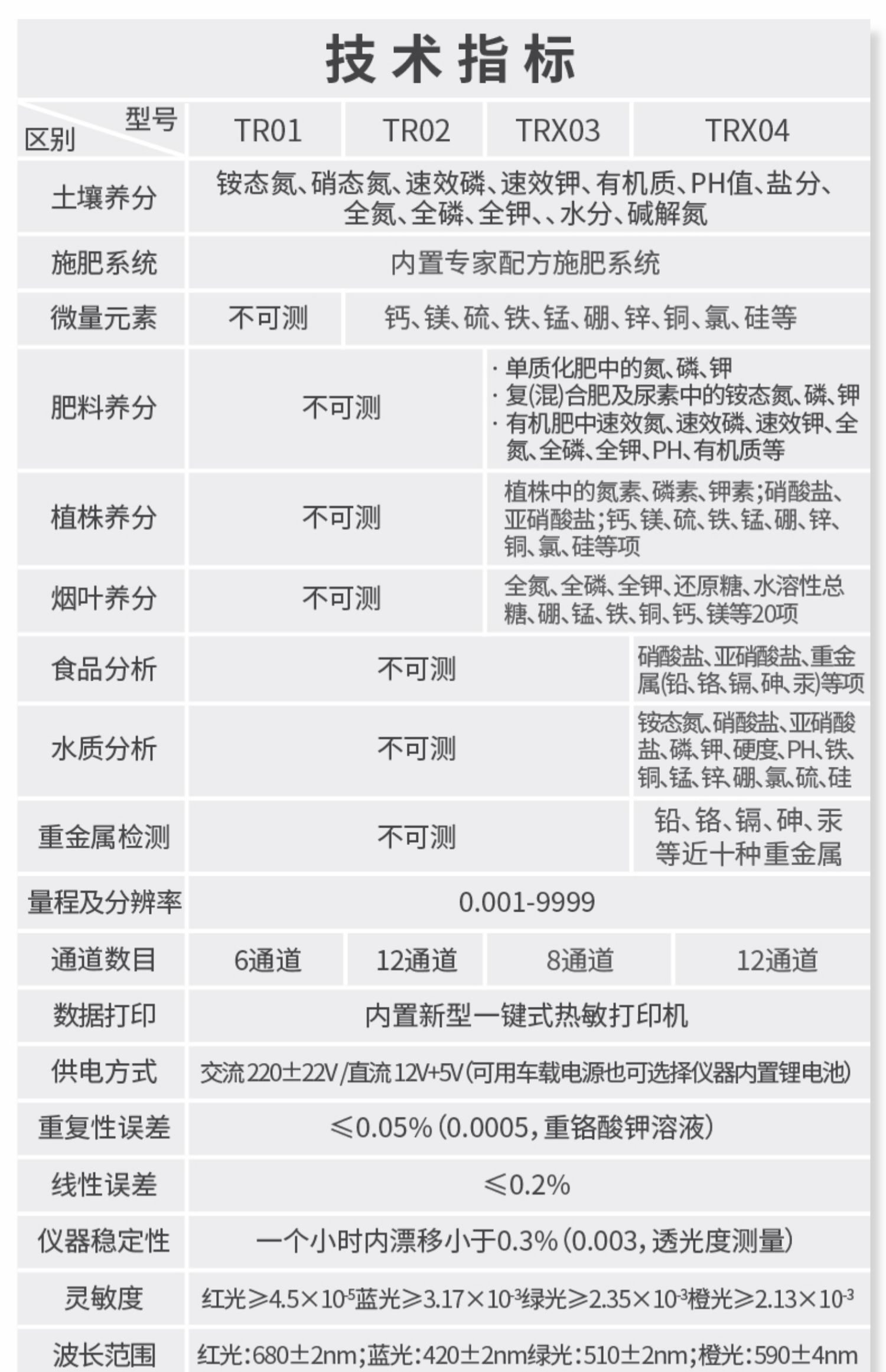 | 電源:交流電:180V~240V、50赫茲;直流電:12V(可接車載電源) | 量程及分辨率:0.001-9999 | 穩(wěn)定性:三分鐘內(nèi)漂移小于0.003 | 線性誤差:小于0.003 | 重復性誤差:小于0.005 | 靈敏度:紅光≥4.5 ×10-5 綠光≥3.57×10-3 | 波長范圍:紅光620±8nm 綠光510±8nm | 測試速度:測一個植株樣(N、P、K)≤40分鐘(含前處理時間) | 數(shù)據(jù)打?。簝?nèi)置高檔一鍵式熱敏打印機 |