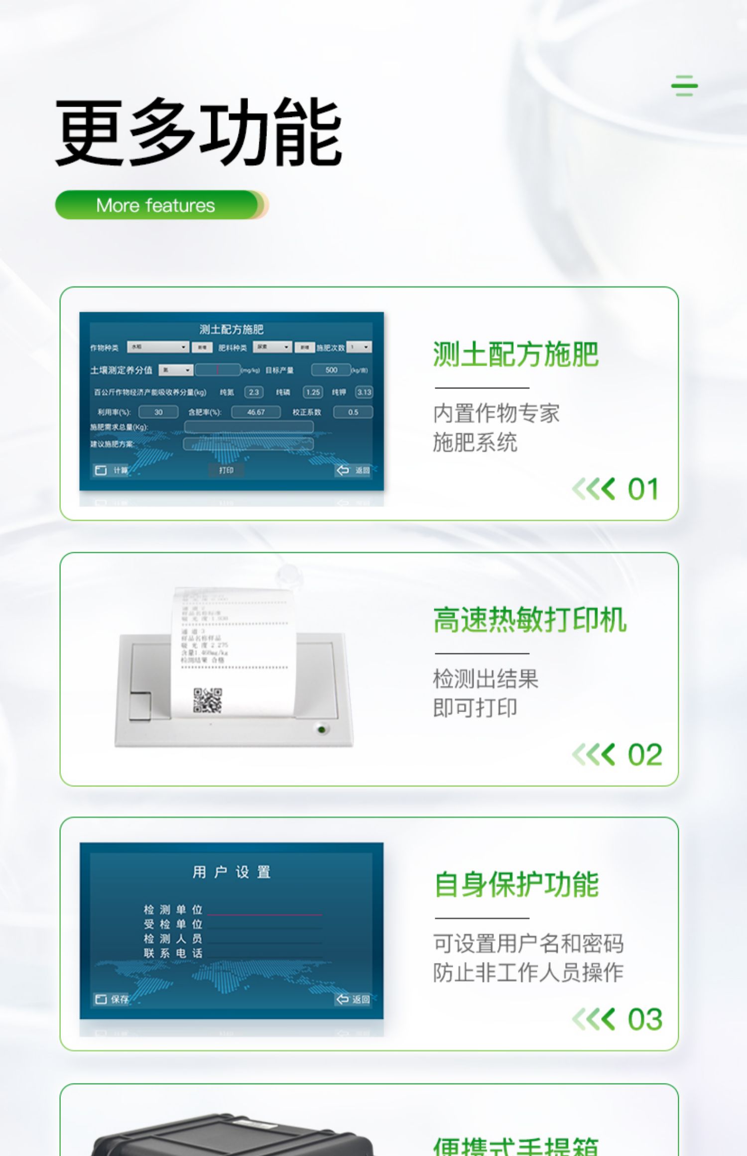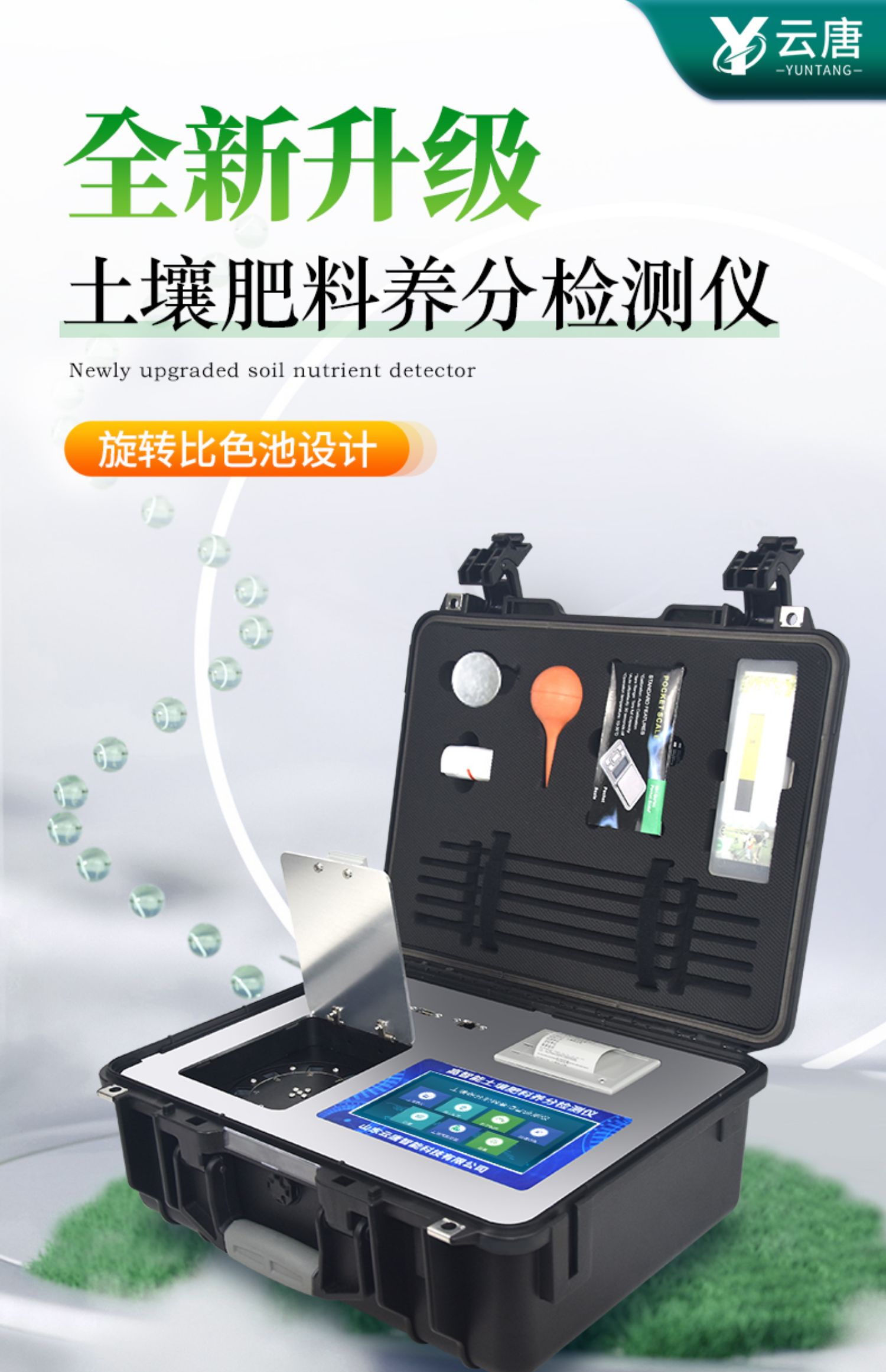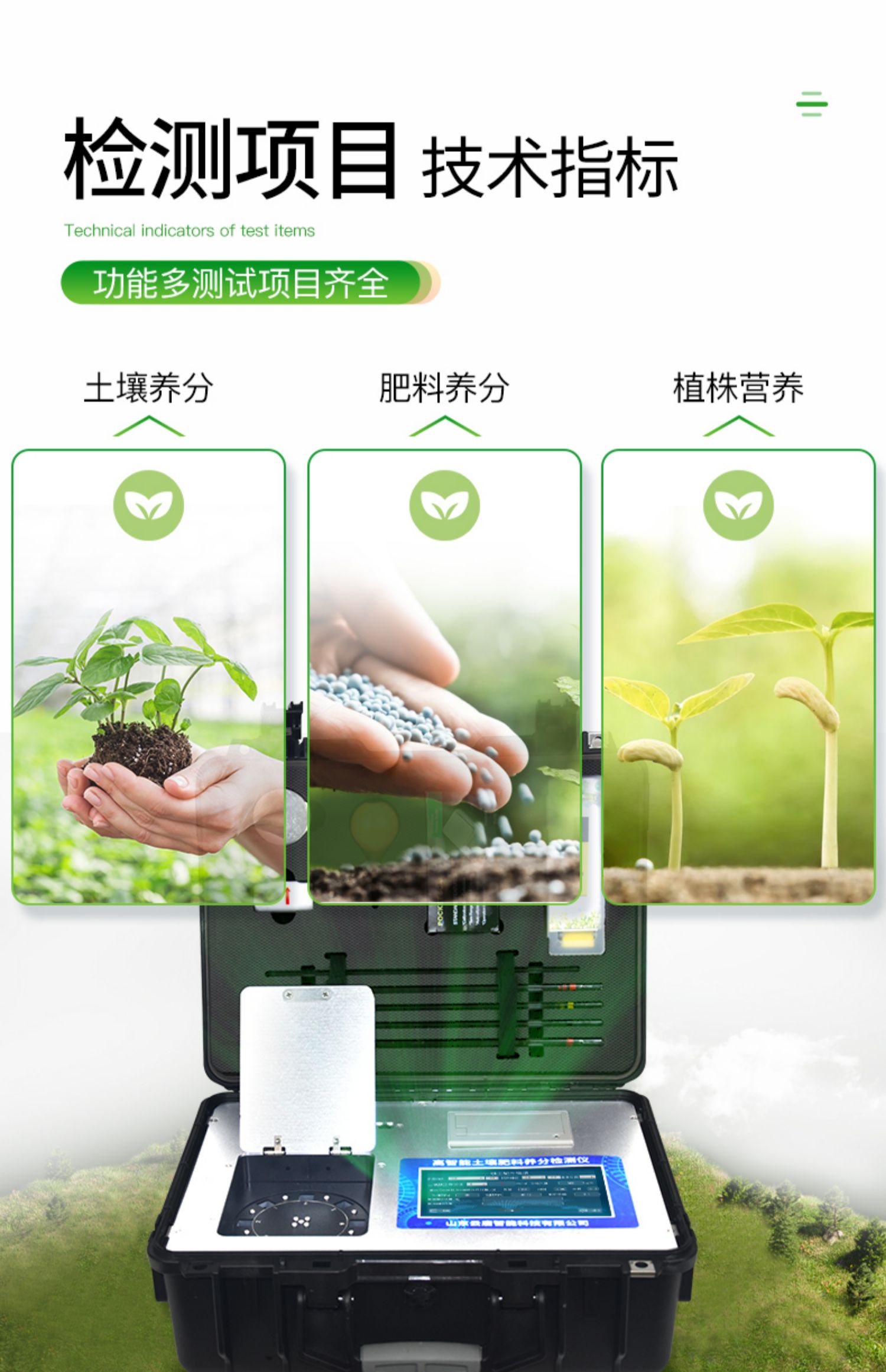 | 功能全:測試項目國內(nèi)外*全(各類藥劑均可選購)。 | 配套齊全:該儀器集藥、器、儀為一體,攜帶方便,相當于一個小型實驗室。適于農(nóng)業(yè)服務部門或農(nóng)資經(jīng)銷商、肥料廠商、莊家醫(yī)院進行農(nóng)化服務。 | 操作簡便、速度快捷,成品藥劑開瓶即用,無須配置。 |