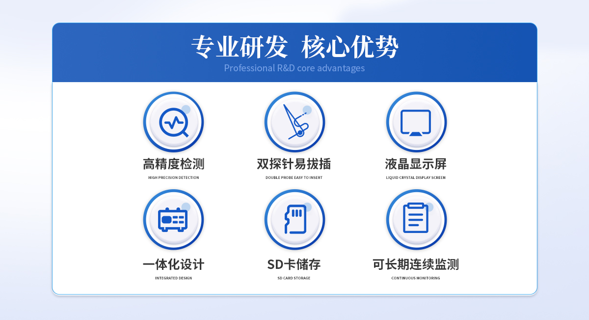 | 雙探針,配有相應的鉆孔工具,容易插拔,可以反復使用 | 采用熱消散法,可恒溫加熱 | 可以長期連續(xù)監(jiān)測 | 不銹鋼探針,采用Teflon涂層,持久耐用 | 采用高精度T型熱電偶直接與數(shù)據(jù)分析儀連接 | 采用大容量SD卡存儲 |